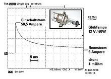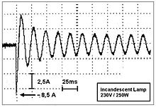 Der Einschaltstrom von Glühlampen und Heizwendeln lässt sich kaum verringern, indem sie im Spannungsminimum der Wechselspannung eingeschaltet werden, da der Prozess der Erwärmung mehrere Perioden der Wechselspannung umfasst (siehe Bild oben).