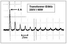 - Der Kern eines Transformators kann kurze Zeit nach dem Einschalten magnetisch gesättigt werden, insbesondere wenn er vormagnetisiert ist (Remanenz). In der Sättigung ist der Blindwiderstand der Spule gering und es kann ein Vielfaches des Nennstroms fließen.