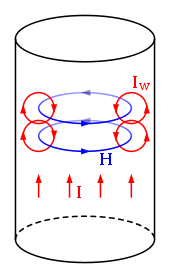 - ↑ Die entgegengesetzten Pfeile suggerieren eine Auslöschung. Wenn man dem naiven Erklärungsmuster folgt, demzufolge der Wirbelströme durch den „eigentlichen“ Strom verursacht werden, müsste aufgrund der Zeitableitung im Induktionsgesetz eine Phasendifferenz von 90° herauskommen. Damit ist jedoch eine Auslöschung nicht möglich.