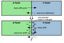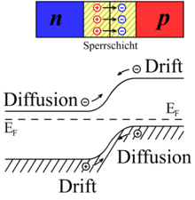 Wenn zwei unterschiedlich dotierte Halbleitermaterialien, ein n- und ein p-dotierter Halbleiter, räumlich eng zusammengebracht werden, entsteht ein sogenannter p-n-Übergang. In dem n-Bereich liegt ein Überschuss an negativ geladenen Elektronen vor, im p-Bereich ein Überschuss an positiv geladenen Defektelektronen, auch als Löcher bezeichnete positiv geladene Störstellen im Halbleiterkristall. Durch den Konzentrationsgradient von Ladungsträgern im Übergangsbereich zwischen n- und p-Bereich kommt es zu einer Diffusion von Ladungsträgern: Elektronen aus dem n-Bereich wandern in den p-dotierten Halbleiter, Defektelektronen diffundieren in den n-dotierten Halbleiter. Die Ladungsträger rekombinieren dort mit dem jeweils anderen Ladungsträgertyp.