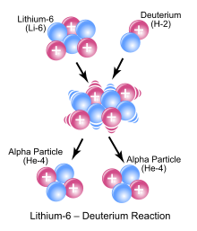 Ein Lithium-6-Kern absorbiert ein Neutron und geht dadurch über in ein Triton und einen Helium-4-Kern: