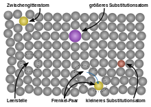 - Fremdzwischengitteratome: Hierbei handelt es sich um einen extrinsischen atomaren Defekt bei dem sich Fremdatome auf Zwischengitterplätzen befinden, man spricht von einem Einlagerungs- oder interstitiellen Fremdatom.