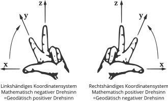 - Das geodätische Koordinatensystem ist dagegen, dem Drehsinn beim Kompass folgend, ein Linkssystem.